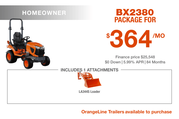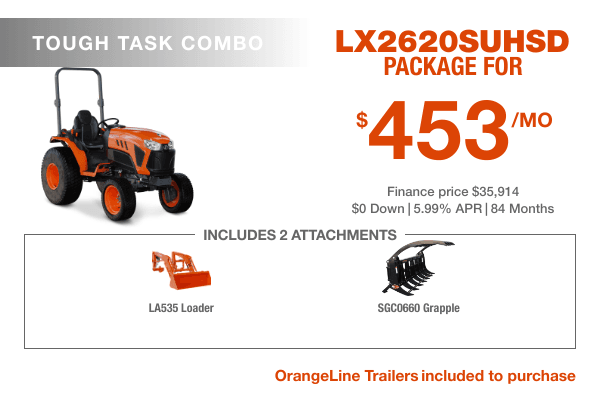 LX3520HSD 4WD TRACTOR W/FOLDABLE ROPS, R-TIRE 15-19.5 R14T GOODYEAR SST, F-TIRE 25X8.50-14 R14T GOODYEAR SST, STEERING STOP KIT, A 60" QA LIGHT MATERIAL BUCKET, A FRONT END LOADER FOR LX3520 AND LX4020, A 15 SERIES BOX SCRAPER, 60" WIDTH, AND A 12 SERIES UTILITY DUTY ROTARY CUTTER, 60" WIDTH