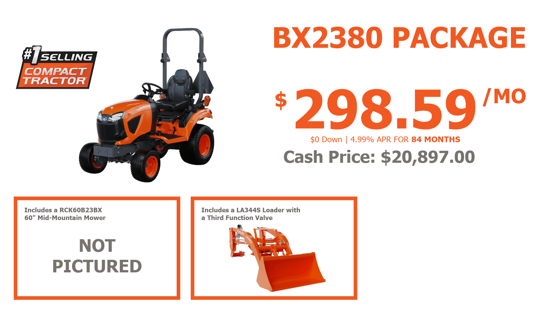 LX3520HSD 4WD TRACTOR W/FOLDABLE ROPS, R-TIRE 15-19.5 R14T GOODYEAR SST, F-TIRE 25X8.50-14 R14T GOODYEAR SST, STEERING STOP KIT, A 60" QA LIGHT MATERIAL BUCKET, A FRONT END LOADER FOR LX3520 AND LX4020, A 15 SERIES BOX SCRAPER, 60" WIDTH, AND A 12 SERIES UTILITY DUTY ROTARY CUTTER, 60" WIDTH