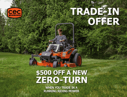 Trade your ridable mower in at our stores in Athens, Lancaster, and Canal Winchester today to receive a bonus of $500 toward a new zero-turn mower.